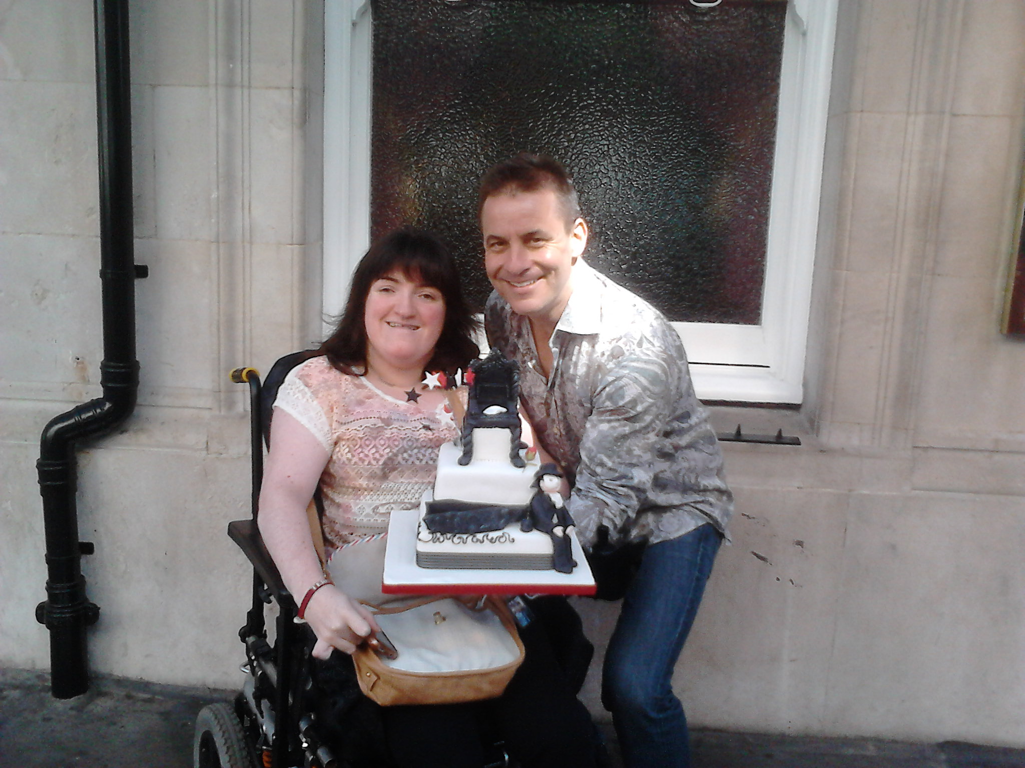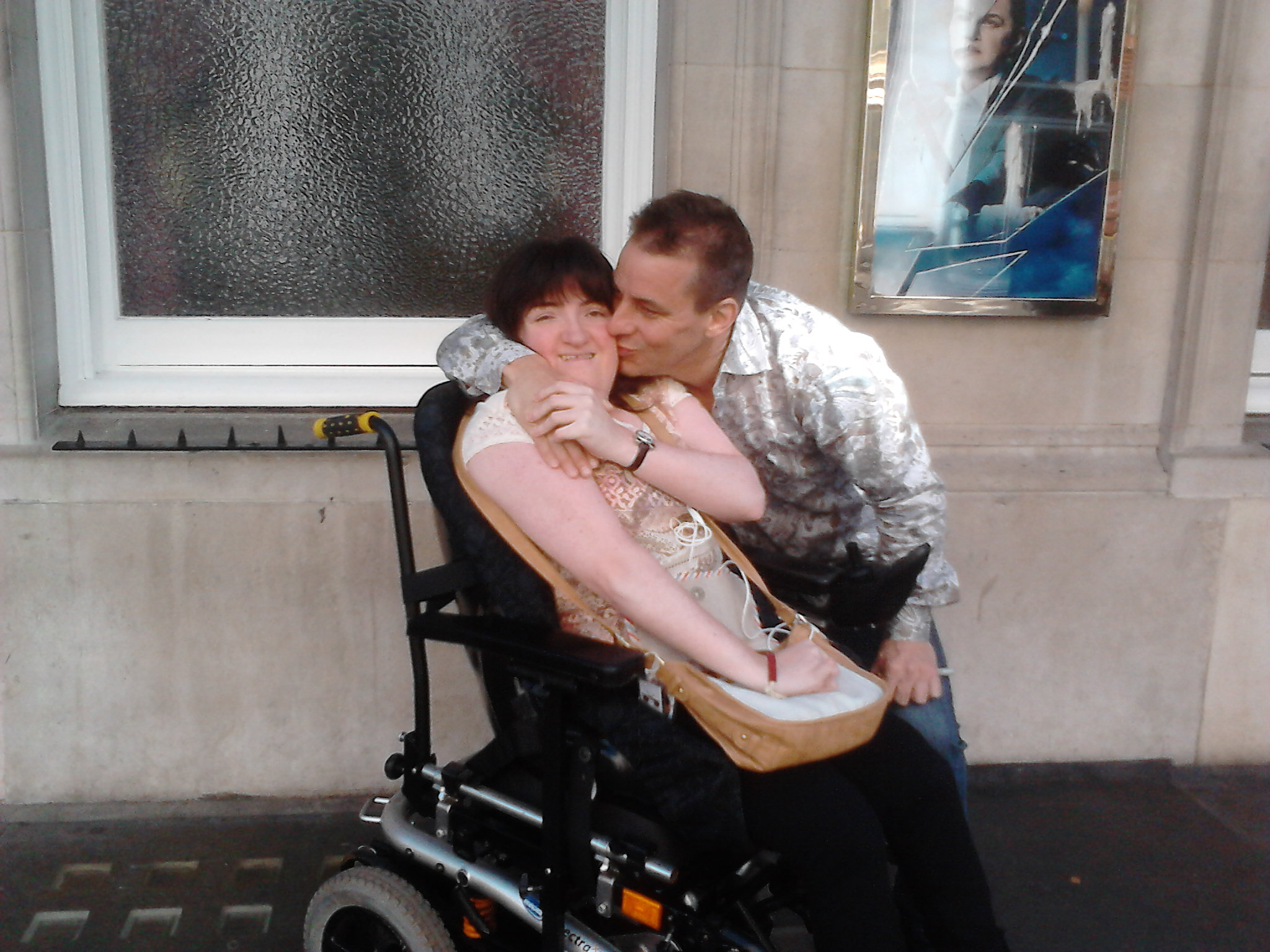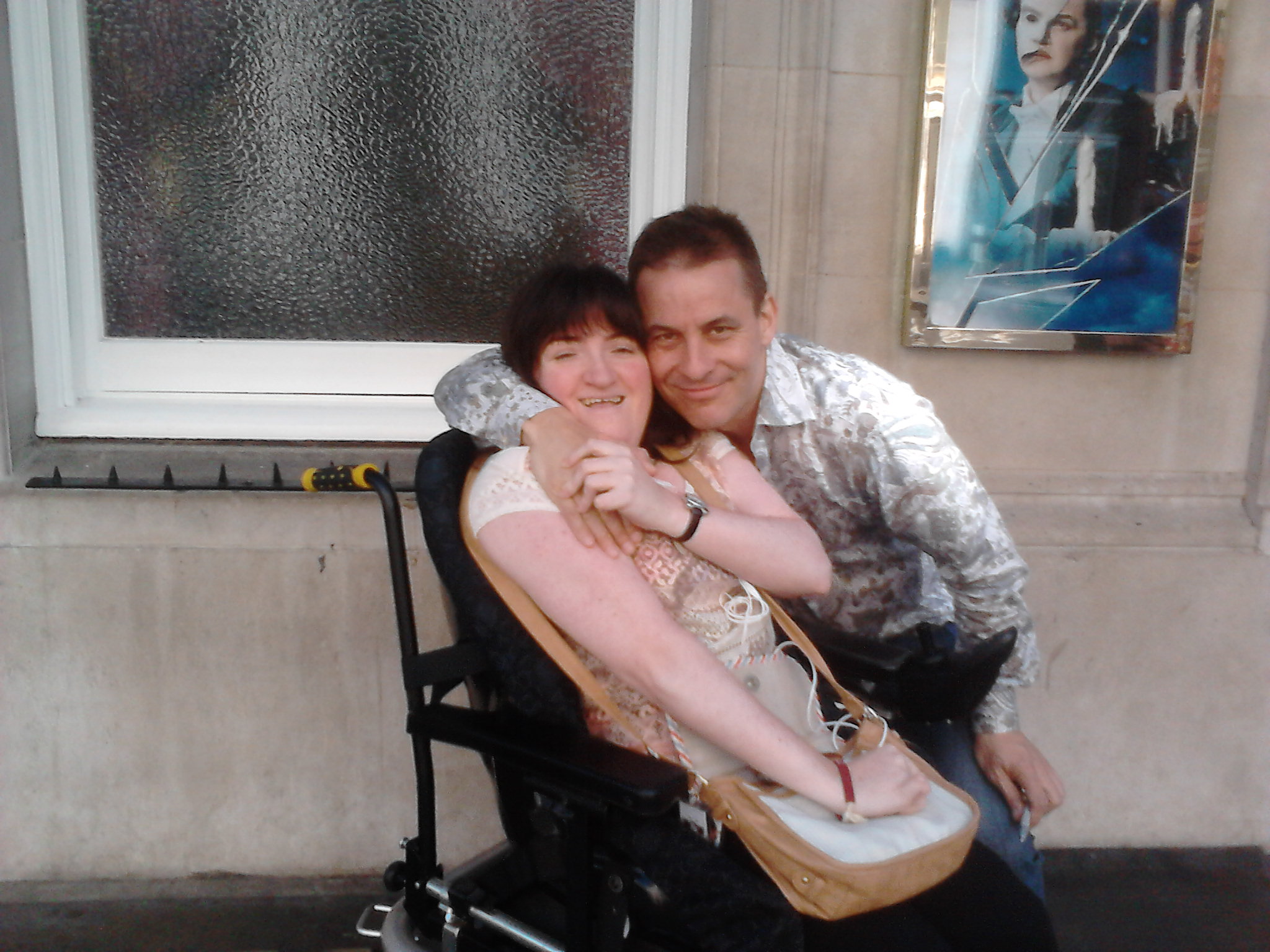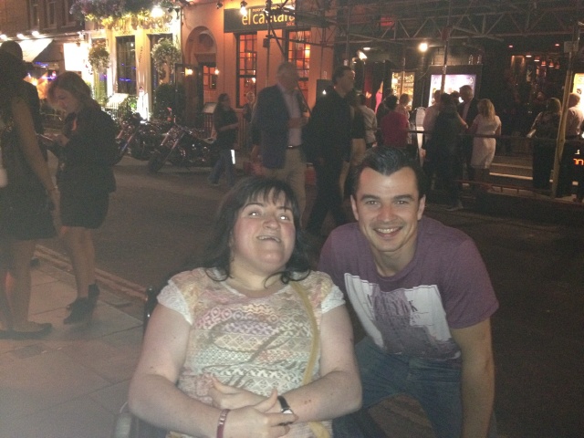 Sure enough, we parked up, got out of the car and what followed was one of the most enjoyable experiences I’ve ever had at a London Stage Door. Marcus is one of the warmest, most charming and sincere gentlemen I’ve ever met- and I can’t thank him enough for the fantastic cuddles, the kiss and just generally making me feel so special just for coming to say hello. Our photos are fantastic- the first I wasn’t sure how to go about it as he’s quite tall and I’m sat down in my wheelchair, but he came and stood next to me, kneeling down slightly. I turned to him and joked: