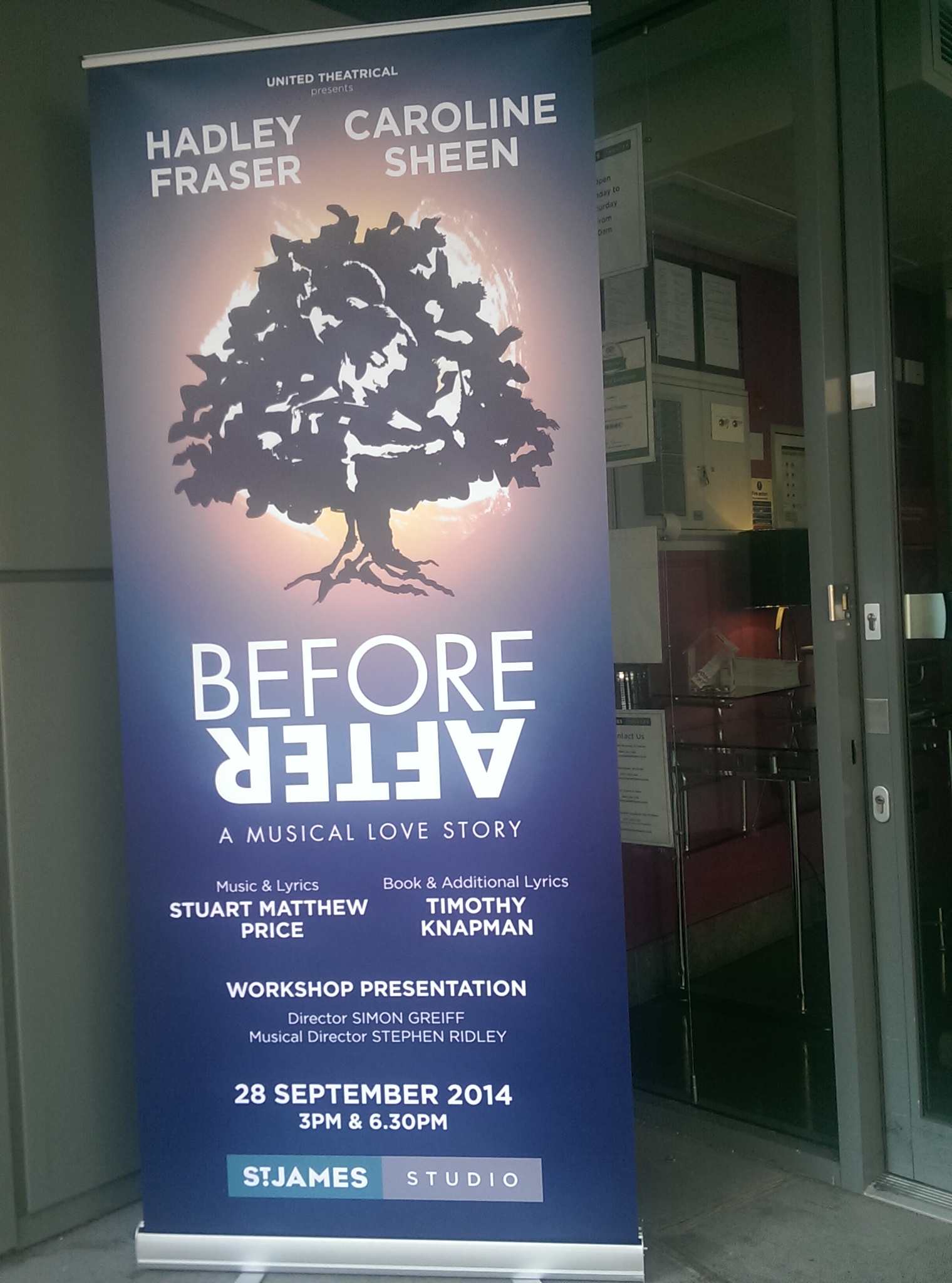 This is the premise of Stuart Matthew Price’s new musical Before After, which I had the privilege and pleasure of seeing yesterday in its workshop format at one of my favourite venues in London, the studio of the St James theatre. Ami meets Ben on a beautiful hillside near a tree, and she recognises him instantly. The reason? He was once the love of her life, and she his. Now however, Ben doesn’t recognise her at all and therein we have the crux of the story: what went so wrong between the couple, and is it possible for them to find each other again? Director Simon Grieff described the show in his introduction as: ‘a conventional love story told unconventionally’, I loved this description for two reasons: first it’s essentially the storytelling tool; Ben and Ami’s story unfolds in Before and After scenes respectively, and secondly the idea of lovers reconnecting really appealed to me as it made a totally refreshing change from the traditional romance. I’ll be really interested to see how the transitions between the two time frames and the production as a whole works on a larger scale beyond the workshop in terms of set, costumes etcetera, but thanks to Rebecca Pitt and Christopher Jay (Design), Pav Kucharski (Lighting and Sound), Stephen Ridley (MD and Orchestrator), Max Gallagher (Assistant to MD), Hannah Ashenden (Cello), John Gregson (Guitar) and the aformentioned Simon Grieff at the directing helm, it’s perfectly clear that if this is how the piece stands at its workshop phase, then it’s in incredibly safe and capable hands.