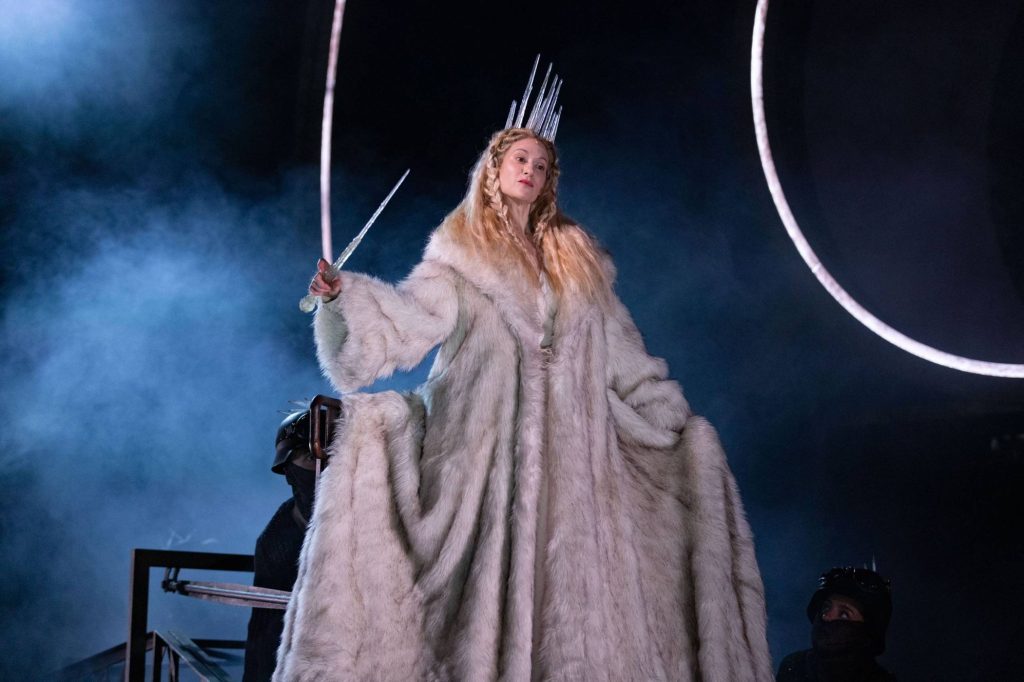 Whimsical is the word that springs to mind when I think about this production: there’s a sense of joy, clever creativity and playfulness that is impossible to resist. The thing that struck me most about that is you can feel it even before we get to Narnia, most notably in the train journey: a combination of movement and striking set pieces. Having set up this evocative feel for the show from the outset means that by the time we do go through that iconic wardrobe, you’re waiting with bated breath, and yet it doesn’t disappoint: furs morph into dancers, snow was falling and the evocative lighting from Jack Knowles transports us utterly into a Narnia trapped in perpetual winter. I also thought the addition of a second smaller circular stage at the back was inspired as it allowed the action and cast to play around with height. There’s always something to draw and delight the eye in terms of choreography (Shannelle “Tali” Fergus) particularly when the White Witch first enters, and the display of her power that draws act one to a close.
