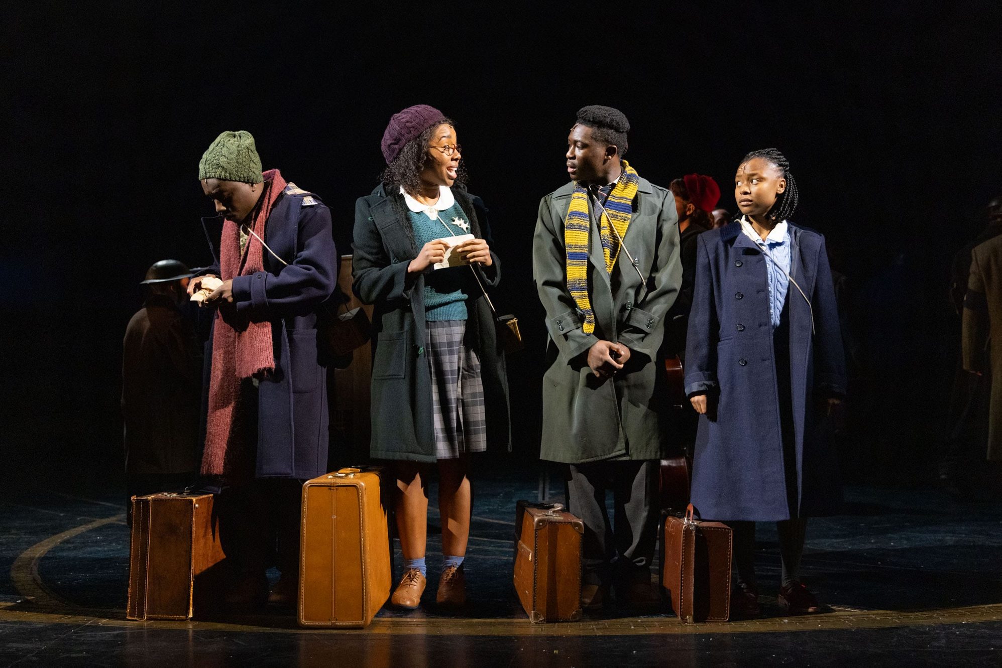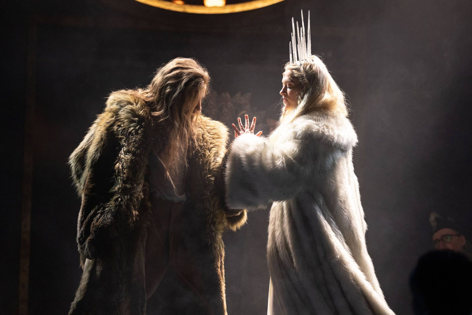 Whimsical is the word that springs to mind when I think about this production: there’s a sense of joy, clever creativity and playfulness that is impossible to resist. The thing that struck me most about that is you can feel it even before we get to Narnia, most notably in the train journey: a combination of movement and striking set pieces. Having set up this evocative feel for the show from the outset means that by the time we do go through that iconic wardrobe, you’re waiting with bated breath, and yet it doesn’t disappoint: furs morph into dancers, snow was falling and the evocative lighting from Jack Knowles transports us utterly into a Narnia trapped in perpetual winter. I also thought the addition of a second smaller circular stage at the back was inspired as it allowed the action and cast to play around with height. There’s always something to draw and delight the eye in terms of choreography (Shannelle “Tali” Fergus) particularly when the White Witch first enters, and the display of her power that draws act one to a close.